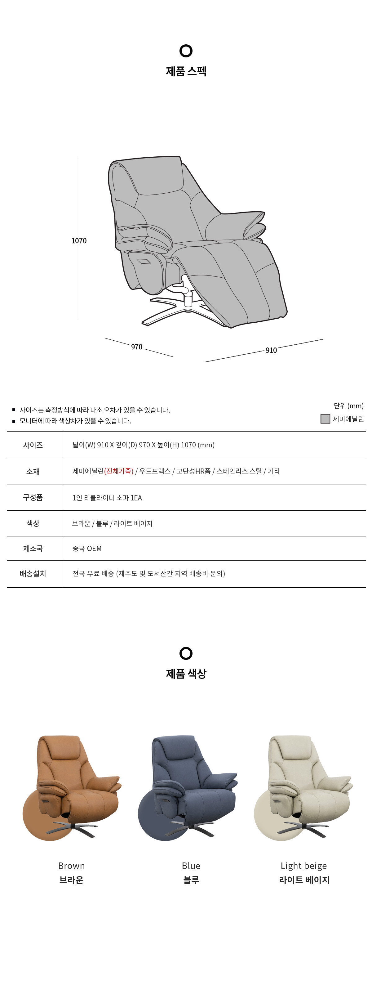 레빈 1인용 리클라이너 소파 체어